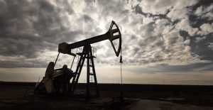 Operating oil well profiled on dramatic cloudy sky